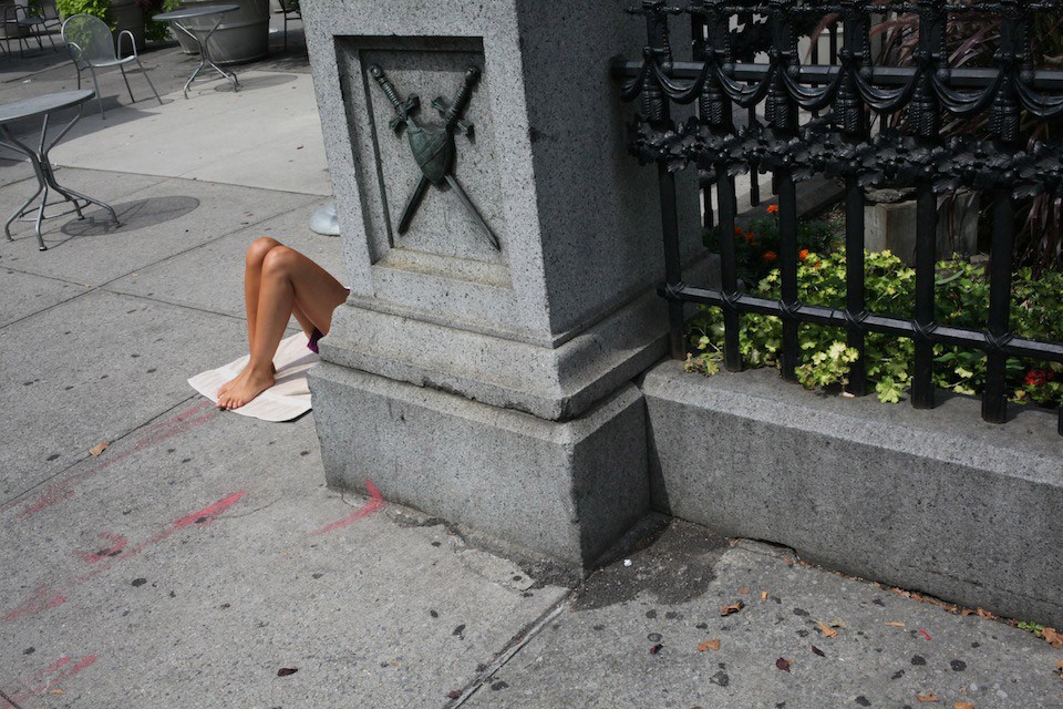 Когда я только начал снимать на Манхэттене, то пытался освоиться. Вдруг из ниоткуда появились мужские голени, потом около них — женские, на них надеты красные, высоко натянутые спортивные носки. Я поначалу подумал, что это спортивная команда. Склонился над камерой, приготовился снимать. И в ту же секунду парень сказал: «Если снимешь, я порежу твоё лицо лезвием». Я почувствовал себя глупо (работая рядом с чёрным гетто, должен был заметить банды). И я, и тот парень по-своему переступили черту.